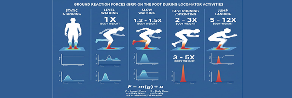 En biomécanique, le « poids » exercé sur le pied est appelé Force de Réaction au Sol (Ground Reaction Force, GRF). Lorsque vous bougez, la force d'impact subie par vos pieds augmente de manière géométrique avec l'intensité de l'activité.