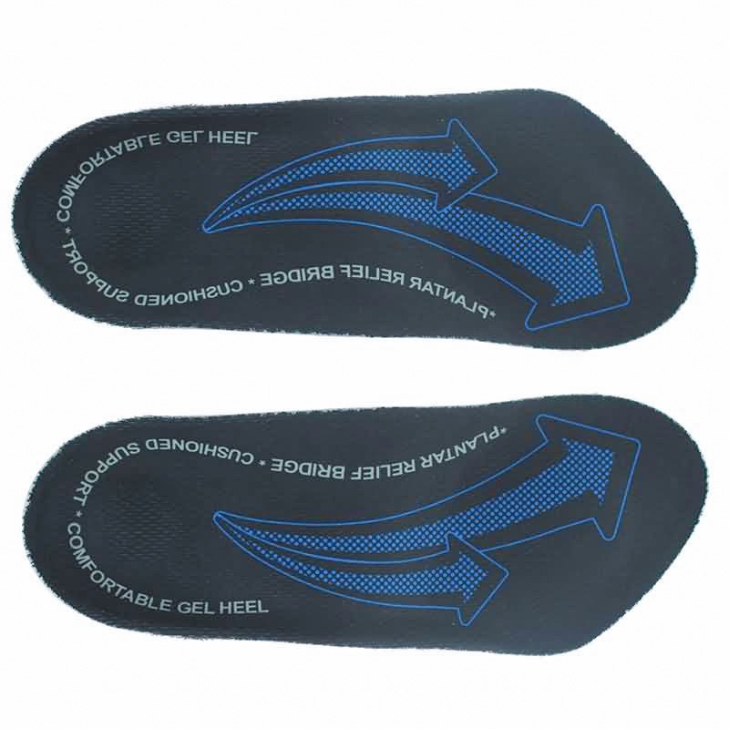 Carbon Fiber Arch Support: Features a rigid carbon fiber composite shell that provides firm, medical-grade support to prevent arch collapse and stabilize the foot during movement. Targeted Heel Gel Cushioning: An integrated blue Gel pad in the heel area absorbs high-impact shock upon heel strike, protecting joints and reducing fatigue. High-Resilience PU Base: Constructed from premium PU material that offers excellent energy return and maintains its shape even after long-term daily use. 3/4 Length Versatile Design: The streamlined profile supports the heel and arch while leaving the forefoot free, ensuring a perfect fit in tight-fitting or shallow footwear. Breathable Fabric Surface: The top layer is covered with a high-performance breathable mesh that wicks away moisture and keeps feet cool and dry. Deep Heel Cradle: The ergonomic heel cup aligns the foot to its natural position, improving balance and providing a secure, stable fit. -